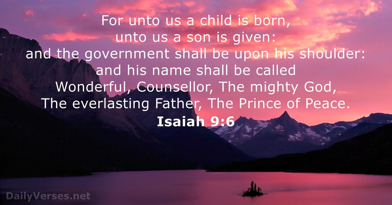 "For to us a Child is born, to us a Son is given; and the government shall be upon His shoulder, and His name shall be called Wonderful Counselor, Mighty God, Everlasting Father [of Eternity], Prince of Peace." — Isaiah 9:6