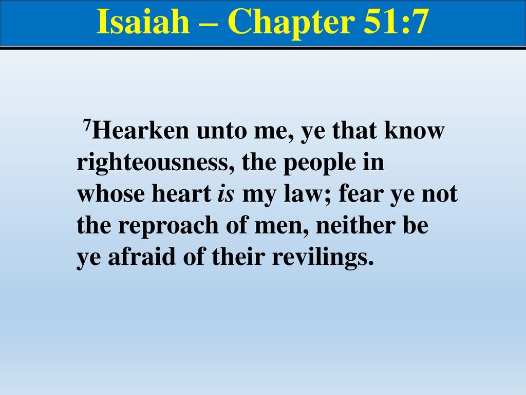 "Listen to Me, you who know rightness and justice and right standing with God, the people in whose heart is My law and My instruction: fear not the reproach of men, neither be afraid nor dismayed at their revilings."
